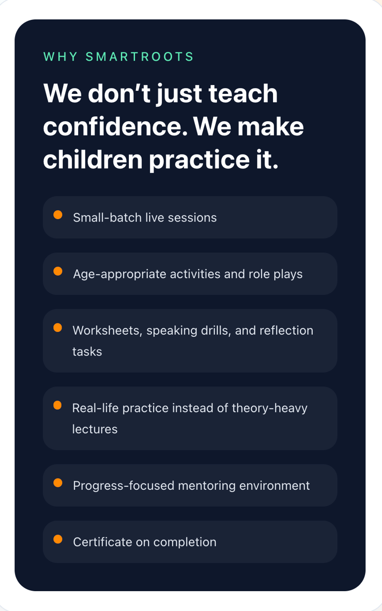 After SmartRoots, the change was not dramatic shouting—it was calm confidence. She now introduces herself clearly and speaks without freezing. What I liked most is the care. No pressure, no comparison—only structured practice. I truly believe this is the right age to start, before fear becomes permanent."